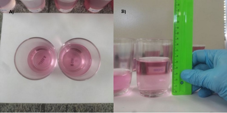 A) Visão superior dos dois copos de vidro quando a cor das duas soluções é igual e B) Medição da altura da Solução de Concentração Desconhecida (SCD)