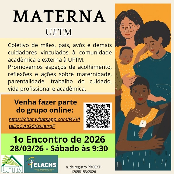 O Projeto de Extensão: Materna UFTM, coordenado pelo Departamento de Educação/IELACHS realiza o próximo encontro no sábado, 28 de março, às 9h30.