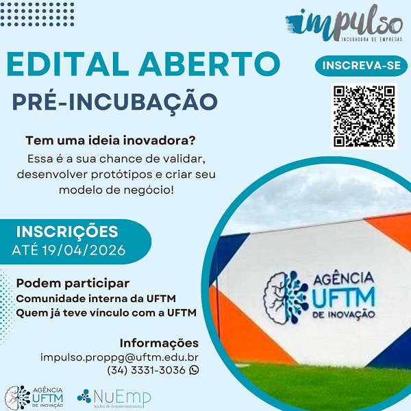 Estão abertas as inscrições para o Programa de Pré-incubação da UFTM, uma realização da Agência UFTM...